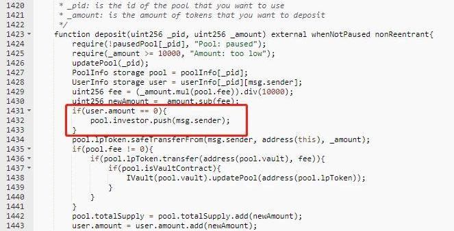 如下图所示,用户在通过deposit调用进行抵押的时候,判断当用户抵押数量为0时,可作为investor地址加入投资收益列表从而获得抵押收益,而该判断可被黑客利用。