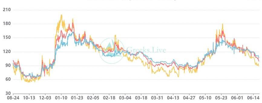以太坊期权成交量2亿美元,持仓量31亿美元。10d87%30d144%90d135%1Y105%各标准化期限IV:今日:1m94%,3m101%,6m107%6/19:1m102%,3m103%,6m109%昨日早间下跌期间,以太坊IV出现了小幅回升,以太坊跌破箱体下沿后并没有破位暴跌,缓解了市场情绪。全期限IV迅速下降,甚至已经低于前几日。
