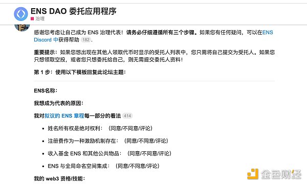 备注:用户可在此链接提名自己为ENS治理代表:https://discuss.ens.domains/t/ens-dao-delegate-applications/815?,拥有web3技能是很好的加分项。