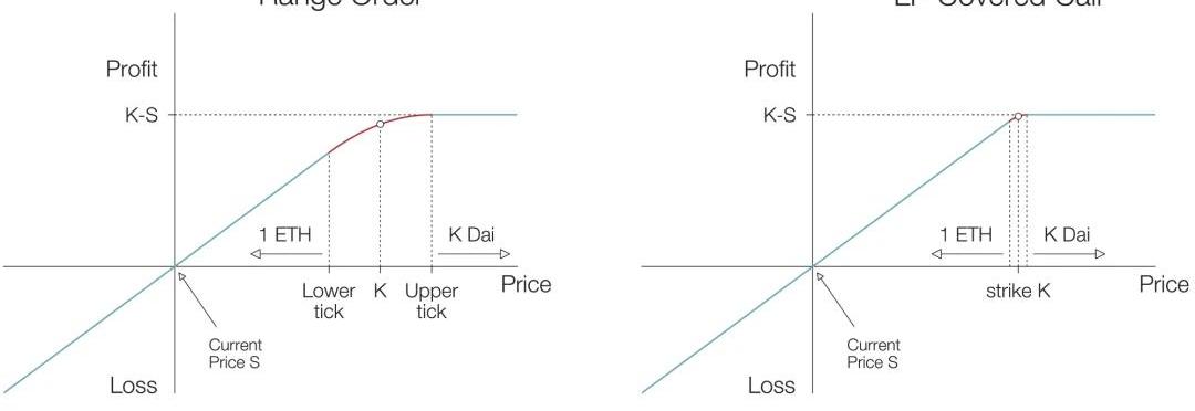 左图:在当前现货价格上方部署流动性,创建一个区间订单,当价格在低点和高点之间移动时,将ETH转换为DAI。右图。将流动性部署在一个狭窄的单点范围内,创造一个"类似备兑看涨期权"的偿付,即当现货价格越过执行价时立即出售ETH。如果我们看一下图谱的另一端,并考虑部署到一个单点的Dai-ETHLP头寸的价值,我们发现该头寸在正好低于该点时,将是100%的ETH,而正好高于该点时,则是100%的Dai。在某种程度上,这类似于一个备兑看涨期权。LP代币完全复制了只有当现货价格在到期时高于行权价格时才会卖出备兑看涨期权中的资产方式。然而,LP代币没有到期日,标的资产通过交易活动自动转换。请注意,由于看跌-看涨平价,备兑看涨的回报图与现金担保看跌的回报图是完全一样的。因此,根据流动性部署时行权价位是高于还是低于当前现货价格,Uniswapv3流动性头寸表现为空头现金担保看跌或备兑看涨。