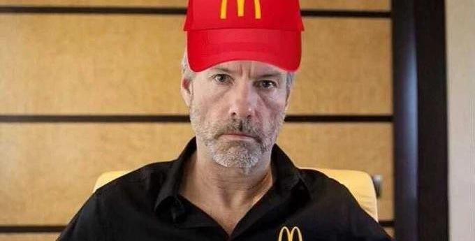 MicroStrategy首席执行官MichaelSaylor带领着他的云软件公司在过去一年中购买了27亿美元的比特币,然而最近市场下跌似乎给他带来了巨大亏损。在一个以MichaelSaylor为主题的表情包中,他头戴麦当劳的帽子、身穿麦当劳的衬衫,暗示如果价格再下跌的话,他就不得不去快餐店打工了。