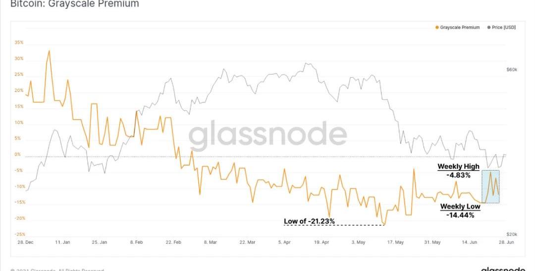 场外交易平台的比特币余额另外,场外交易平台也是矿工与大买家达成交易的另一个主要场所。整个2021年,场外交易平台的比特币余额逐渐下降。从4月到6月,余额一直保持在6000-8000枚比特币之间,过去两周净流出约1134枚比特币。综上,矿工抛压并不算大。|灰度GBTC溢价情况
