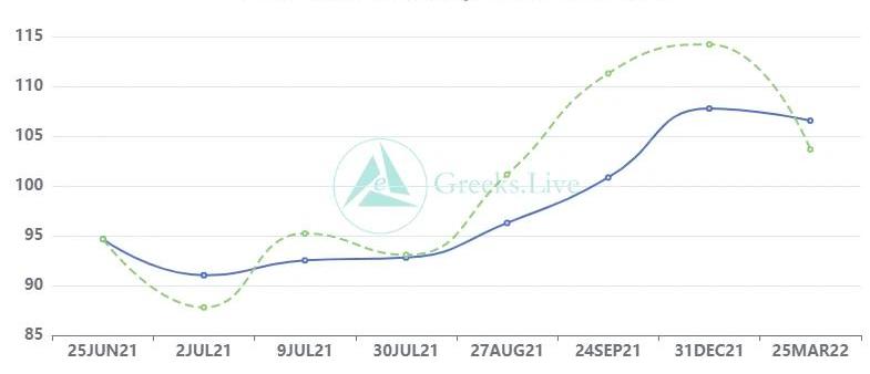 播报数据由Greeks.live数据实验室提供。以太坊已经明显跌破趋势线,今天是主流数字货币普跌的行情,弱势震荡再继续。前几日播报中提到,本轮反弹力量不足,比特币40000美元关键点位没有消息面或者资金面的支持难以稳住。期权成交量4.96亿美元,期权持仓量为56亿美元。10d106%30d113%90d90%1Y73%各标准化期限隐含波动率:今日:1m81%,3m88%,6m93%,DVol94%6/18:1m87%,3m90%,6m93%,DVol97%比特币价格窄幅震荡,前几日播报中提到,本轮反弹力量不足,比特币40000美元关键点位没有消息面或者资金面的支持难以稳住。目前35000USD上方估计还要继续震荡,比特币各期限IV下跌趋势明显但速度不快,已经处于年内较低水平。