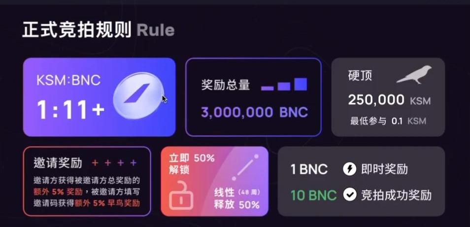 其中,Bifrost联合创始人Lurpis,进行了题为“BifrostKusama插槽竞拍细则发布”的分享。Lurpis表示,投资Bifrost的理由很简单。参与平行链竞拍的用户可以对比三个指标。一是平行链的奖励数量;二是未来奖励出来的流通量是否是在你可以接受的范围之内;三是在奖励数量之上,要看这个平行链是否是有价值的,未来的成长空间是否足够大。在这些方面,Bifrost具备突出的优势。以下为Lurpis演讲分享,由Odaily星球日报整理:现在这个阶段,正好到Kusama马上竞拍的时间了,我先公布两个事件。第一,在今天晚上的9点钟,我们会正式开启Kusama的竞拍。第二,白名单用户可提前24小时参与,所以在11日晚上21点,如果你没有预约,那个时候你也可以有参与名额,这是目前Kusama卡槽拍卖的时间点。我分享一下具体的细节。大家可能等得比较久,我们一直都在做一些平行链的测试、开发,包括整体的Rococo的测试。先跟大家汇报一下,Bifrost经过了两年时间的开发,目前我们有哪些进展?首先,刚才说了,我们有SLP和SALP两个协议,一个是面向POS的,一个是面向卡槽竞拍的。面向Staking的,我们有微以太,目前有4500万美金左右的规模。像今年,刚刚过去六个月,我们举办了43场线上活动和6场线下活动,媒体报道有链闻、星球日报、币世界、巴比特、火星财经、Blocklike、哔哔News,以及海外的Cointelegraph,都是我们非常好的合作伙伴。我们认为,目前是合作大于竞争的格局。Bifrost正式上线后,我觉得合作远远大于竞争,大家在每一个自己的业务上都会有一个专场,像Zenlink、达尔文都是我们非常好的合作伙伴,我们也获得了220万美金的投资。生态发展方面,目前Bifrost在海外有非常高的热度,我们在Cointelegraph有6000粉丝量,在Twitter也有很多粉丝量,在国内主要的宣发媒体是公众号,我们所有的内容都会在公众号上宣发。Tokeninsight评级我们也拿到了BB级。具体想了解的用户,可以在Tokeninsight官网上下载我们的评级报告。整个Kusama到Bifrost的竞拍,中间有一个时间等待期。目前Kusama预热已结束,接下来是Kusama正式开拍的时间。因为Bifrost只有一个主网,所以我们拍完Kusama之后,会有一个业务的启动时间。业务运行稳定之后,我们的SLP和SALP都会在上面运行,之后会开放波卡卡槽竞拍,把Kusama的资产上线到波卡,完整的上线流程是在卡槽竞拍之后上线Bifrost的平行链,上线公投模块,再发放vsKSM和vsbond金额到用户手中。平行链上线之后,Dex会支持vsKSM的交易。Kusama的规则,预约阶段我们一直没有公开,现在有几个平行链已经在Crowdloan创建了,我觉得这批做的比较优质的平行链项目,未来都是有机会拿到卡槽的,在拿到卡槽之前,大家需要做一个众贷,帮助平行链的上线。其实每个平行链都有自己的优势,Bifrost其实是为质押资产释放流动性的协议,所以我们也会在这方面做的有差异性。1、代币结构。Bifrost只有一个主网,所以我们50%的ecosystem都会拍Kusam和Polkadot平行链,Kusama拍三周时间,Polkadot拍两年时间。按时间对比,我们认为Kusama是业务落地的第一个平行链,所以我们会拿出相较于拍波卡平行链同样的成本给到大家。目前来说Kusama平行链占整个平行链拍卖的21.4%的份额,也就是300万个BNC。2、vsKSM预约数量。目前有3万地址参与,目前全网地址总量12000多个,我们可以占整个数量的30%,我们过滤了一下链条上面的数据,也看了一下这些地址里有多少KSM的balance,目前国内、美国、日本是几个重点参与的国家。3、正式竞拍规则。我们拍Kusama,1个Kusama至少可以拿到11个BNC,总量有300万个Token的释放。我们会有一个硬顶,在参与Kusama的时候,你可以有一个保底的收益,不会因为Kusama的收益变多硬顶变低。25万个Kusama之内都可以获得奖励,但超过25万Kusama并不代表结束,只是那一部分的Kusama不会拿到额外的收益,所以你在参与25万个Kusama之中,至少可以获得1:11的比例。预约之后的关键环节,邀请人和被邀请人可以建立绑定关系,被邀请人可获得邀请人中奖励的5%,作为额外奖励。比如A邀请B,B总奖励有100,你可以拿到5个。