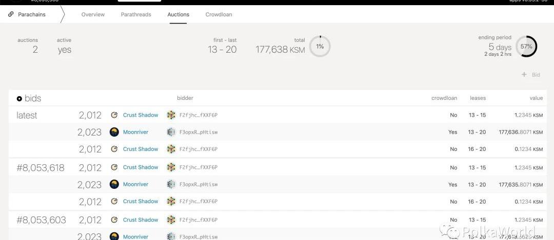 随着Statemine的上线和第一次平行链拍卖的完成,第一批平行链已经成功接入Kusama网络。我们又接近一步Polkadot白皮书中概述的可互操作的多链愿景。《Polkadot官方发文:我们离可互操作的多链愿景又近一步!》Karura在赢得第一个插槽后,随即分享了一些拍卖的数据,以及之后的计划和路线图,在这里查看:《Karura赢得拍卖后的下一步计划是什么?Crowdloan奖励是多少?|PolkaWorld专访》《Karura的竞拍数据与上线流程》截止发文:第二次拍卖将于6月29日下午15:30左右结束目前出价最高的是Moonbeam的金丝雀网络Moonriver包括正在进行的和已经完成的Crowdloan,854,412KSM已被锁定在Crowdloan中!如果你不清楚Crowdloan页面一些参数的意思,可以查看这个图,PolkaWorld已经标注了中文解释!