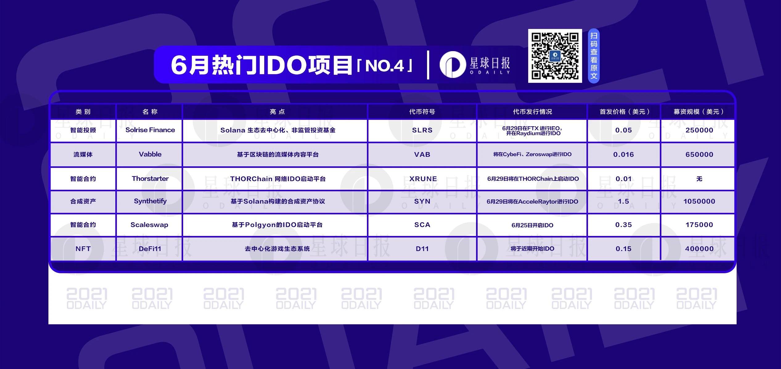 项目名:Synthetify简介:Synthetify是一种去中心化协议,允许创建和交易所密切跟踪基础资产价格的合成资产。Synthetify的合成遵循SPL令牌标准,允许它们轻松地与Solana生态系统中的DeFi应用程序集成。由于依赖于智能合约和区块链预言机的基础设施,Synthetify利用Solana为平台用户提供快速、廉价和直观的交易体验,同时保持完全去中心化。官网:https://synthetify.io/IDO详情:6月29日Synthetify将在AcceleRaytor进行IDO,分为公募和RaydiumIDO两部分。公募共出售700,000SYN,每枚SYN价格为1.5USDC,共融资1,050,000USDC,池开放时间为6月29日12:00,共持续4小时;RaydiumIDO时SYN初始价格为1.5USDC,Raydium将于6月30日13:00开启SYN-USDC流动性池,之后将在RaydiumSwap界面上进行交易。具体规则可点击下方链接查看:https://raydium.medium.com/synthetify-launching-on-acceleraytor-3755b4903f88
