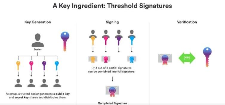 与链锁技术一样,NNS可以从零开始,现在当用户与NNS进行交互时,NNS用他们的Canister进行计算,并接收来自该计算的结果,他们可以通过在这些结果的子网签名来验证这一点。关于子网公共密钥,子网公共密钥可以使用子网从NNS获得的证书进行验证,这就像是链锁技术的两个部分。第一部分就是我们刚才讲的,更高级别的子网可以为其他子网生成私钥;第二部分是从NNS接收私钥的子网如何管理这些私钥。节点可能会崩溃,因而需要更换;节点也可能会受到危害,所以需要剔除。在这两种情况下,需要在新的节点集合之间重新共享子网已接收的私钥,因此为了维护子网所收到关键信息,我们使用了ThresholdSignature,这种特殊签名实际上是一种听起来像是一组必须一起运行的算法。首先我们有一个生成私钥的算法,这就像有一个被信任的经销商不断产生公钥和私钥,然后分发给不同的参与者,当大部分的参与者同意签名后,这些部分签名可以组合成相对于原始公钥的完整签名,并进行验证。