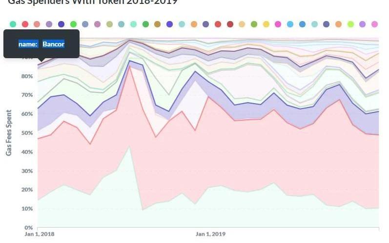 从上图可以看出,2018年到2019年期间,以太坊区块链活动相当平静,每月花费的总gas金额几乎没有超过40,000ETH。但是从2020年开始,以太坊区块链活动开始上涨,gas费用支出呈抛物线状增长,在2020年9月,以太坊4周gas费用总支出达到650,000ETH峰值,而那时ETH价格只有月400美元——时间真的过得好快!通过分析各种DeFi协议实体总计支出的gas费用所占的比例,或许我们可以对相关数据有更近距离的了解。在本文中,我们想按照时间推移查看gas费用支出排名前三十的协议实体在汇总历史数据中所占的比例。坦率地说,DeFi协议支出的gas费用取决于许多因素,比如:有多少用户与智能合约交互;执行函数所需的计算强度;当时以太坊区块链上的gas整体价格。在我们进行深入探讨之前,必须注意一点:2018-2019年以太坊市场格局非常不同,当时许多非常活跃的智能合约如今已不再使用,我们可以从下图中看到2018-2019年期间的排名前三十名的gas消费实体情况,数据来源Metabase。