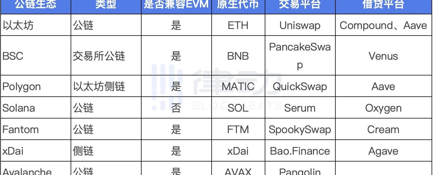 1、交易平台去中心化交易平台曾在以太坊中出现了百花齐放的发展态势。在去年的swap大战中,不同项目纷纷号称能够解决Uniswap高滑点与无常损失等问题。然而经过近一年的发展,目前市场上除了Curve还能在稳定币交易领域保持一定的市场份额外,其余经过惨烈的竞争,基本上只剩下了Uniswap及其模仿者。也正是因此,我们在后发的公链生态中看到了及其单调的发展模式:几乎所有的交易类产品,都是分叉了UniswapV2的代码,并融合了SushiSwap的代币经济模型与产品策略。这种集体性质的「致敬」,一方面证明了两者在交易逻辑与代币机制方面的成功,一方面又使得同类产品间的竞争更加激烈。目前除了Uniswap自身可以凭借更先进的底层架构在竞争中进一步获取优势。其他新兴的交易平台,都只能通过更强的运营、更激进的代币激励模式,以及更贴近市场的产品策略来获得市场份额。当然这里不得不重点提一下特立独行的Solana生态。Solana不但在公链底层没有原生支持EVM,其上的主流交易平台Serum也颇为独树一帜。其不但从底层重新设计了产品逻辑,大胆融合了订单簿的交易模式。还凭借针对专业交易者的大量优化,满足了之前被市场忽略的机构投资者需求。不论Serum最终能否取得成功,其大胆的创新都将为整个行业留下宝贵的经验与遗产。2、借贷平台应该说,相较于交易赛道不同做市模式的百花齐放,借贷平台在底层商业逻辑上较为类似,几乎全部建立在超额抵押模式之上。唯一能体现出一些差异的,便是各平台的风控策略与代币激励机制。最近BSC平台中借贷龙头Venus遭受的攻击,可以说便是风控制度设计上的问题。对于用户与投资者来说,除去项目初期的代币激励,长期来看选择经营更稳健,风控制度更完善的平台,或许才是保护自己资产最好的方式。3、底层公链项目的成功必然要依托于其底层公链的成功。因此对底层公链的判断,也成为了一个需要投资者关注的问题。根据目前的市场状况,可以说只要以太坊的扩容问题一天不解决,市场就会有极大的动力,去寻找手续费更低,交易量更高的新平台。而在目前已经取得初步成功的生态型公链中,除Solana以外,几乎所有的选手都选择了兼容EVM的技术路径。兼容EVM给新公链带来了极大的启动优势,新公链可以直接利用许多在以太坊上已经成熟的基础设施,如MetaMask钱包、DeBank浏览器等。同时,以太坊生态中的优秀项目,也仅需要简单的适配,便可以在兼容EVM的其他公链上部署。最典型如SushiSwap,目前其已经在8个EVM兼容的公链上部署了自己的智能合约。自然,EVM及其主流编程语言Solidity都有一些固有的缺陷。但如果想要另起炉灶,确实需要较大的精力来进行基础设施建设与生态冷启动。当前,除了Solana凭借FTX团队的大力推动,一定程度上进入了良性循环,其余公链则纷纷选择通过各种方式兼容EVM。可以说,选择EVM兼容的公链生态,无论对投资者还是项目方,都是当前更为稳妥的策略。本文由于篇幅所限,难以对其他诸多的生态型公链进行全面的分析。但这并不意味着这些公链没有超越现有平台的潜力。我们注意到,像Near、Cosmos、Polkadot、Algorand等诸多公链项目,当前都在积极地进行社区推广与生态建设。预计在不久之后,我们就能看到更多平台的生态逐渐成熟,也将会给普通用户带来更多的选择与投资机会。我们期待着多链时代的真正降临。