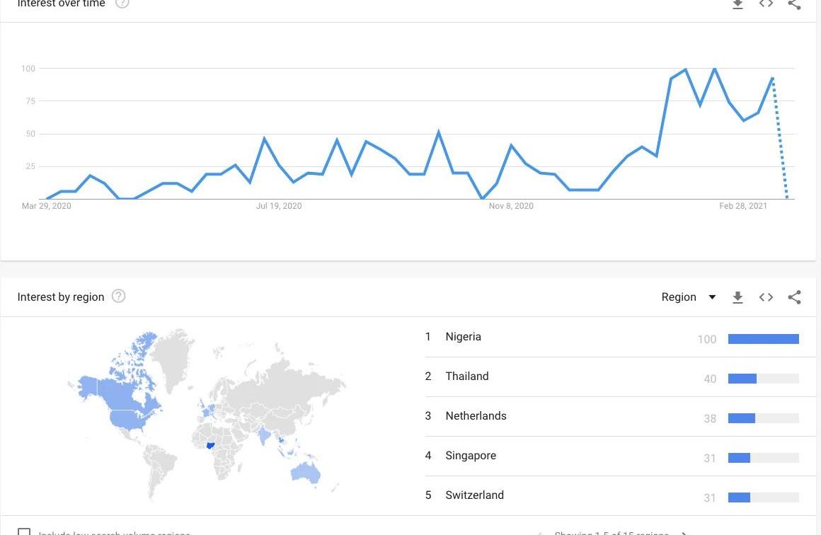 虽然DeFi上更多的用户来自发达国家,但从谷歌趋势看出,发展中国家的人们对DeFi的兴趣也日益浓厚。截止今年3月,尼日利亚和泰国是过去12个月中搜索“去中心化金融”最多的两个国家。