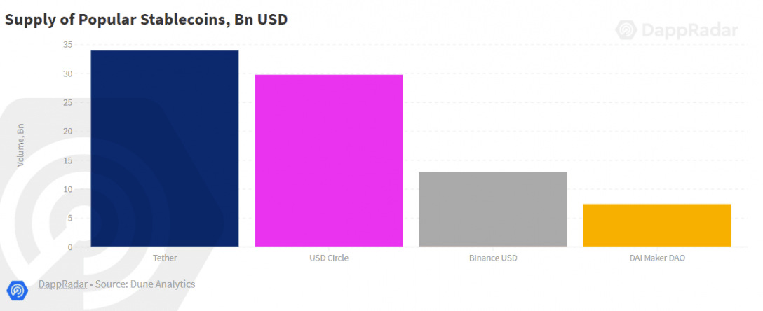 2)在以太坊DEX中,稳定币的优势更加明显。虽然ETH和BTC的包装版本在以太坊中广泛使用,但稳定币的供应量很大,以太坊上供应量最大的稳定币Tether和USDC的供应量都超过了BUSD的两倍多。
