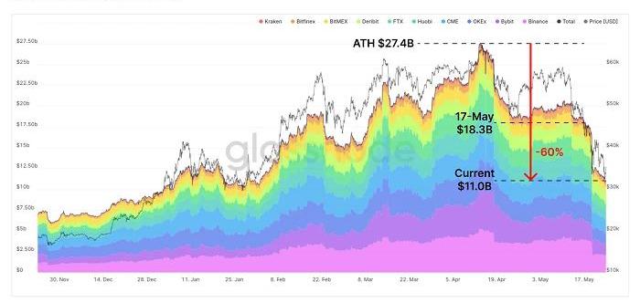 上图展示了交易所费用占比变化趋势。最后,在交易所方面,衍生品市场出现了大规模去杠杆化,导致市场出现一连串的抛售、追加保证金和清算活动。4月中旬,期货未平仓合约规模曾达到274亿美元峰值,但从那时开始到五月底,超过60%的未平仓合约已被清算。值得注意的是,期货未平仓合约只是加密货币市场中可用的一种杠杆形式,而额外的保证金来源来自加密贷款、期权市场、以及越来越多的DeFi协议,我们将在本文中继续讨论他们对市场抛售会产生什么样的反应。