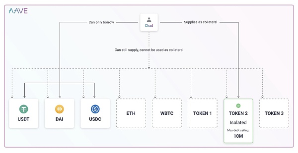 当社区成员提交在 V3 上创建新资产市场的治理提案时,该提案可以寻求将资产列为“隔离抵押品”,以便提供这些“隔离”资产的用户只能借入 Aave Governance 已“许可”的稳定币 以隔离模式借款,最高达到指定的债务上限。