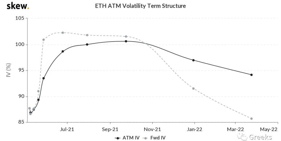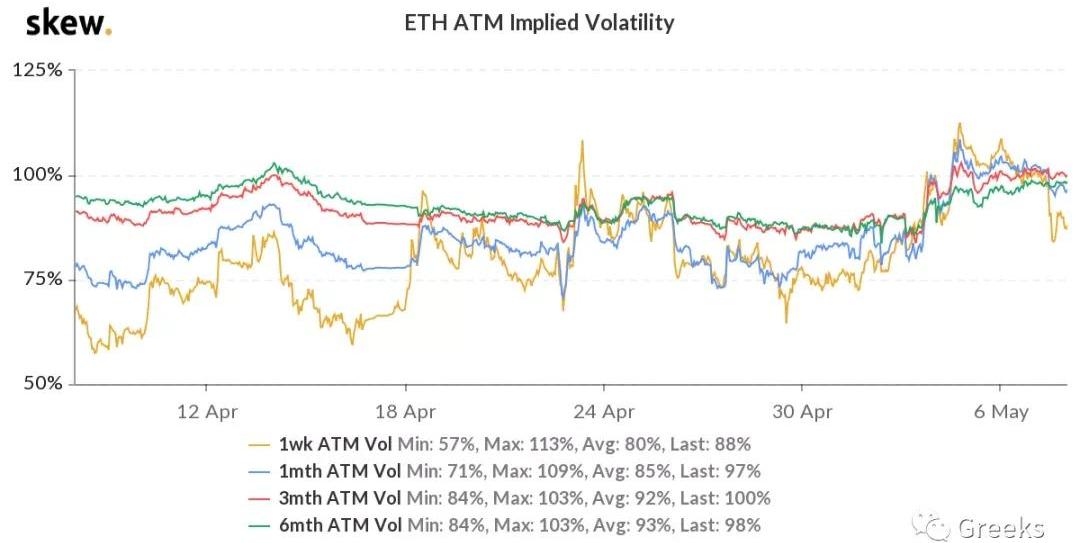 以太坊期权成交量3.8亿美元,持仓量56亿美元。10d133%30d102%90d93%1Y92%各标准化期限IV:今日:1m95%,3m100%,6m98%5/7:1m102%,3m101%,6m98%以太坊各期限IV都有所下降,特别是超短期当周IV,一天下降15%,Skew也在快速偏转,短期平值看跌价格两天下降了近一半,但实际上最近两天以太坊的价格没怎么动。期限结构倒挂程度已经不太能占日历价差的便宜。