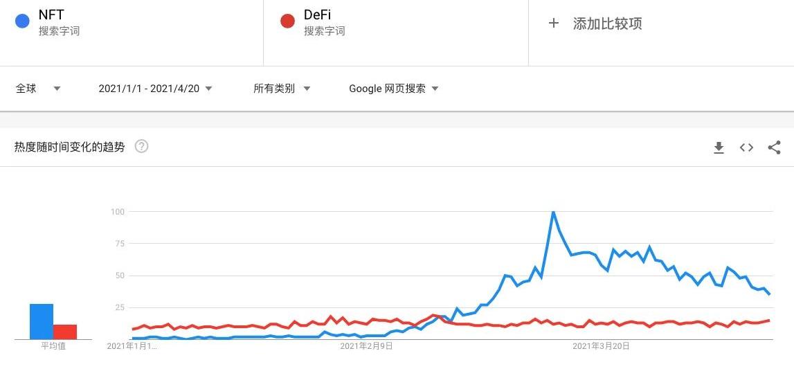 2021年第一季度“NFT”谷歌搜索趋势,对比“DeFi”