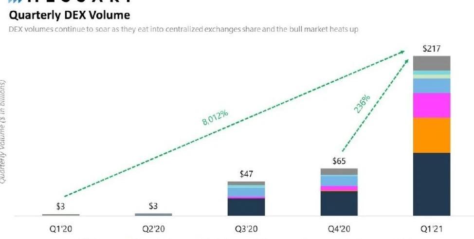 而在去中心化交易所方面,一季度的交易量已经超过了两千亿美金,虽然量能比中心化交易所仍然少了许多,但也要考虑到中心化交易所刷量的水分,而去中心化交易所的量能都是实打实的,再静不下去,今年突破1万亿美金的概率是很大的。去中心化交易所部分除了Uniswap方面占比依然大,BSC上的Pancakeswap的横空出世直接占据了第二大份额,近期其代币cake涨的也比较厉害,这种情况也并不令人意外吧,毕竟BSC目前的体量也是逐渐变大,在去中心化项目方面的影响力自然也会逐渐变大。另外还是需要提醒一下大家山寨币的问题,这一次大部分山寨币大幅下跌,反弹的时候量能也是并不大,这些山寨币中,有些币种后续会和比特币一样,资金依然会介入,后面反而有更强势的机会,而另一方面则是有些资金永远都不会再次介入的山寨币,可能永远就这么无量下去,最后重新分化一部分强势山寨币,更多的山寨币则是烟消云散被淘汰,持有山寨币的小伙伴要提高警惕。