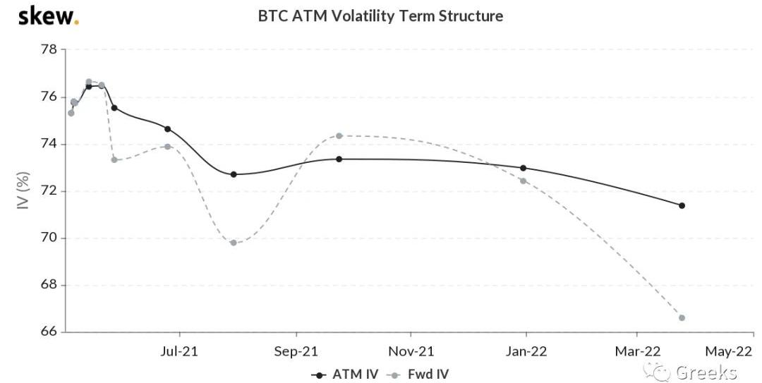 播报数据由Greeks.live和Skew.com提供。历史上有过多次比特币和以太坊行情不同步的情况,但是像最近分化这么明显的行情并不多见。比特币突破55000美元已经两个半月了,现在又回到了55000美元,而在这两个半月中,以太坊已经从2000美元涨到3500美元了。期权成交量8亿美元,期权持仓量为90亿美元。10d90%30d70%90d80%1Y68%各标准化期限隐含波动率:今日:1m75%,3m72%,6m73%,DVol87%5/4:1m76%,3m74%,6m74%,DVol87%在以太坊和狗狗币轮流发力的当下,比特币价格的疲软显得格外明显,全期限IV维持昨日水平。比特币突破55000美元已经两个半月了,横盘总会在某一个时点结束,持续的横盘积累力量。