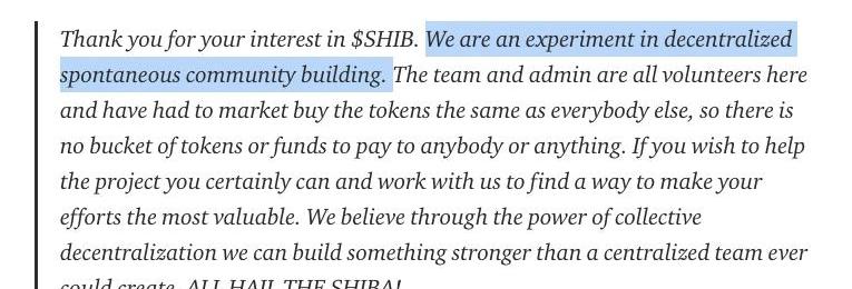 创立SHIB的想法,源于2021年年初的WSB散户硬刚华尔街事件。在散户差一点就可以采摘到胜利果实的情况下,“游戏规则”的制定方直接“拔网线“叫停,散户们只能接受这个无可奈何的结果。在SHIB的白皮书表达的也很直接,“这都是中央集权的结果”。如果,没有集中的团队,没有资金,没有直接的领导,这样建立起来的项目,最后会走到哪里去?这就是SHIB成立最初的“制度”。SHIB的口号是“AllFromZero”,换句话,团队想通过最初一无所有的状态,在最后依然能达到市场现有中心化运营团队能达成的运营效果。SHIB的团队便是如此形成。SHIB的创始人Ryoshi,是个行业内的老玩家。据悉,他对以太坊十分推崇,一直热衷于找到一种方式,可以通过技术手段确保一个项目从零开始,以纯粹的去中心化方式发起和成长。Ryoshi曾公开表示,SHIB的团队并不是预先组织好的,团队中的各个成员从未合作过,他们是一支由开发者、设计师、版主、营销人员和财务出纳自发形成的新团队。用SHIB白皮书中的原话来说,他们将SHIB视为是“一场社会性试验”,“去中心化自发社区”,参与SHIB的每个人都一样,众生平等,一切从零开始,这样一看,是不是有点真正的区块链的意思?