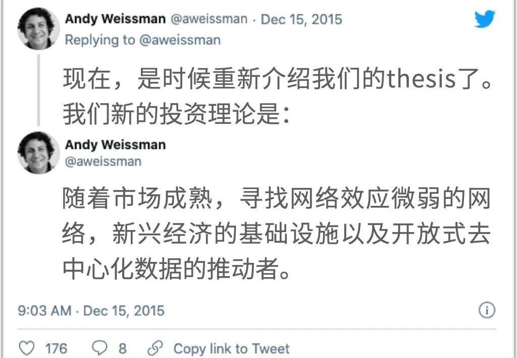 投资回报由溯元育新团队计算我们对投资主题的重视和坚持几年前就在《thesis1.0》里写过了,我们搞早期投资,就是由强烈世界观驱动的,而且我们还会强力推动这种世界观的传播。在那篇文章中,我们也试图描述了投资主题的动态机制是什么样的,或者说可以演变进化成什么样的。过去几年,我们明显感觉到USV的投资主题在进化,2015年的今天,我们把Thesis2.0呈现给你。自USV成立以来,我们一直专注于互联网「应用层」的投资。应用层建造在相对开放和扎实的基础设施之上,而基础设施让无需许可的连接成为可能。一开始,我们把所有和应用层相关的投资都叫做「大型网络效应」——它们有广大的用户基础、大部分面向消费者、能够或者有潜力触达许多人。几年前,Brad把这个投资主题浓缩到了一条推文里: