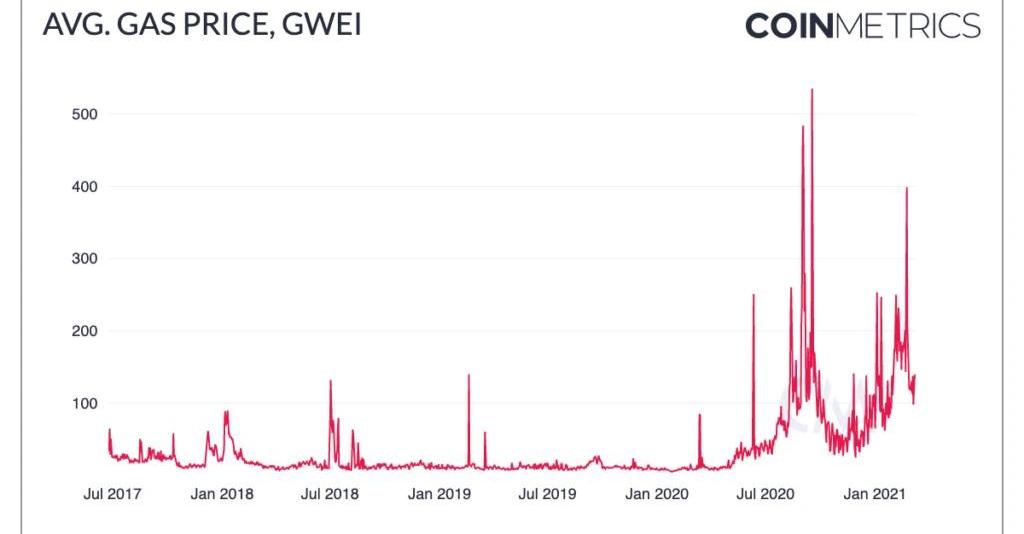 来源:CoinMetrics网络数据图表Gasprice第二个Gasprice。人们可以指定任何他们想要的Gasprice,无论高低。Gasprice只决定了用户每使用一单位Gas所需支付的金额,并不会改变执行交易所需的Gas量。因此,在不同时间执行的完全相同的智能合约交互,根据使用的Gasprice,可能会有迥异的Gas费用。这往往会导致混淆,特别是对于新用户来说。Gasprice也往往会出现波动,并且取决于对区块空间的需求。由于DeFi的兴起,平均Gasprice在2020年夏天飙升至历史最高水平。去中心化交易、链上套利、收益率耕种和新Token推出的增长都促使交易优先权的竞争急剧上升,从而导致Gas价格不断攀升。2020年9月17日,在Uniswap意外的UNIToken空投后,平均价格达到峰值,超过500GWEI。2021年随着DeFi的持续飙升,Gas价格再次飙升,以太坊价格的大幅上涨也带来了新的交易者和投机者。