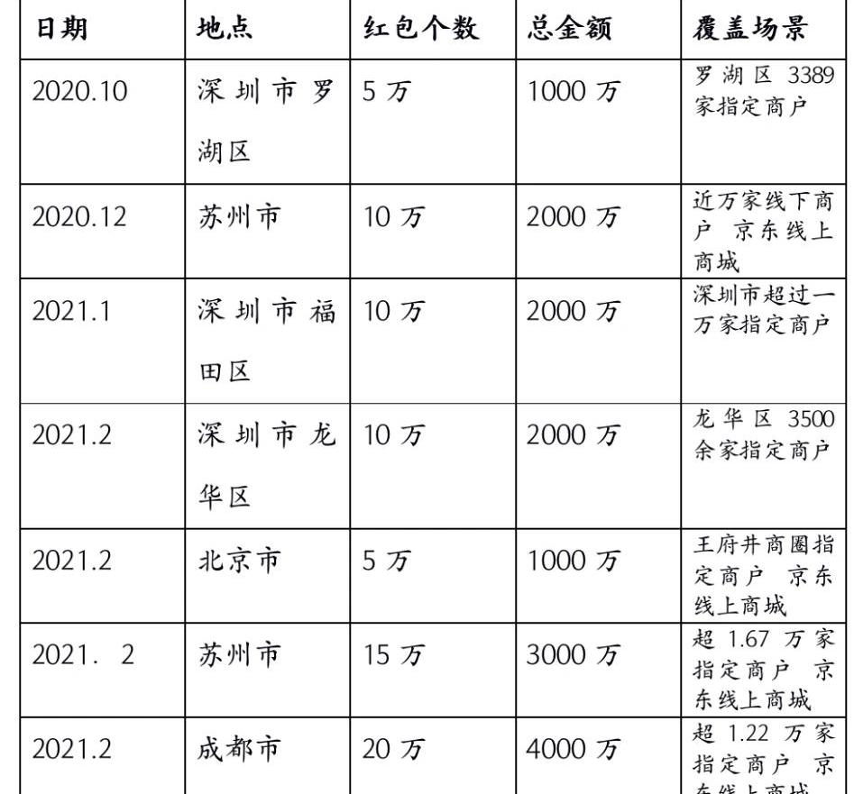 2020年4月17日,中国人民银行数字货币研究所相关负责人表示,“数字人民币研发工作正在稳妥推进,先行在深圳、苏州、雄安新区、成都及未来的冬奥场景进行内部封闭试点测试,以不断优化和完善功能”,由此明确了数字人民币“四地一场景”的试点安排。经过多年的研究,数字人民币终于开始面向公众进行推广,主要表现形式就是派发数字人民币红包。2020年10月,深圳市人民政府联合人民银行开展了数字人民币红包试点,通过抽签方式将一定金额的资金以数字人民币红包的方式发放至在深个人数字人民币钱包,社会公众可持发放的数字人民币红包在有效期内至罗湖区指定的商户进行消费。这是数字人民币的第一次试点。2020年12月,苏州发布消息将向符合条件的苏州市民发放2000万元的数字人民币消费红包,每个红包金额为200元,红包数量共计10万个。2021年2月6日,北京市东城区人民政府围绕冬奥消费全场景,主办了“数字王府井,冰雪购物节”数字人民币试点活动。