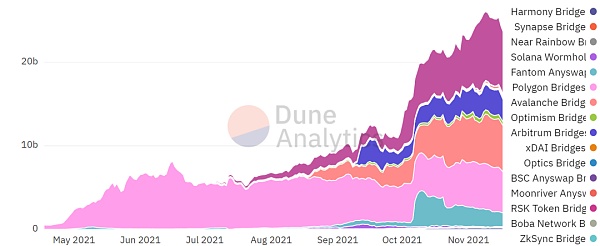 以上介绍的只是L2跨链桥领域的一部分,除了这种通用的跨链桥,还有一些专项桥,比如支持L2到 L1 的高速跨链桥 Across Protocol、NEAR上的彩虹桥、波卡SnowBridge、侧链xDAI桥、Zksync桥、二层网络Optimism 桥等等,据估算,仅在与以太坊链接的桥中,就锁定着大约237.3亿美元的资金,其中有45.6亿锁定在了Anyswap桥上,占到了总量的近20%。