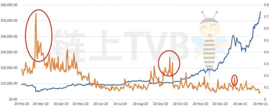 2020年3月时,BTC价格下跌,交易频率激增,体现出市场的恐慌,一方面有大量的BTC卖出,另一方面又有大量的BTC买入。2020年9月,BTC曾经冲击12000美元,瞬间站上12000美元大幅度回落。当时正是SUSHI等Defi币疯狂大涨,而BTC等主流币相对表现平平。当时交易量也出现上涨,同样是出现市场恐慌情绪,大量的卖出和买入。2021年1月,BT曾经回调,这里也有过交易频率相对升高。然而这个交易频率相比前两次,还是很低的。所以很快,BTC在回调半个月以后,继续了上涨的趋势。事实上,2017年12月,BTC同样也是类似的形态。可是,观察现阶段的BTC,完全没有交易频率的明显上涨,反而最近几天的交易频率在下降。可是这几天的BTC价格却在上涨。这说明,买入的力量更占优势,而卖出的力量没有多少。BTC的持有者仍然有更高的预期。为了看得更清楚,来看2021年以来的图表: