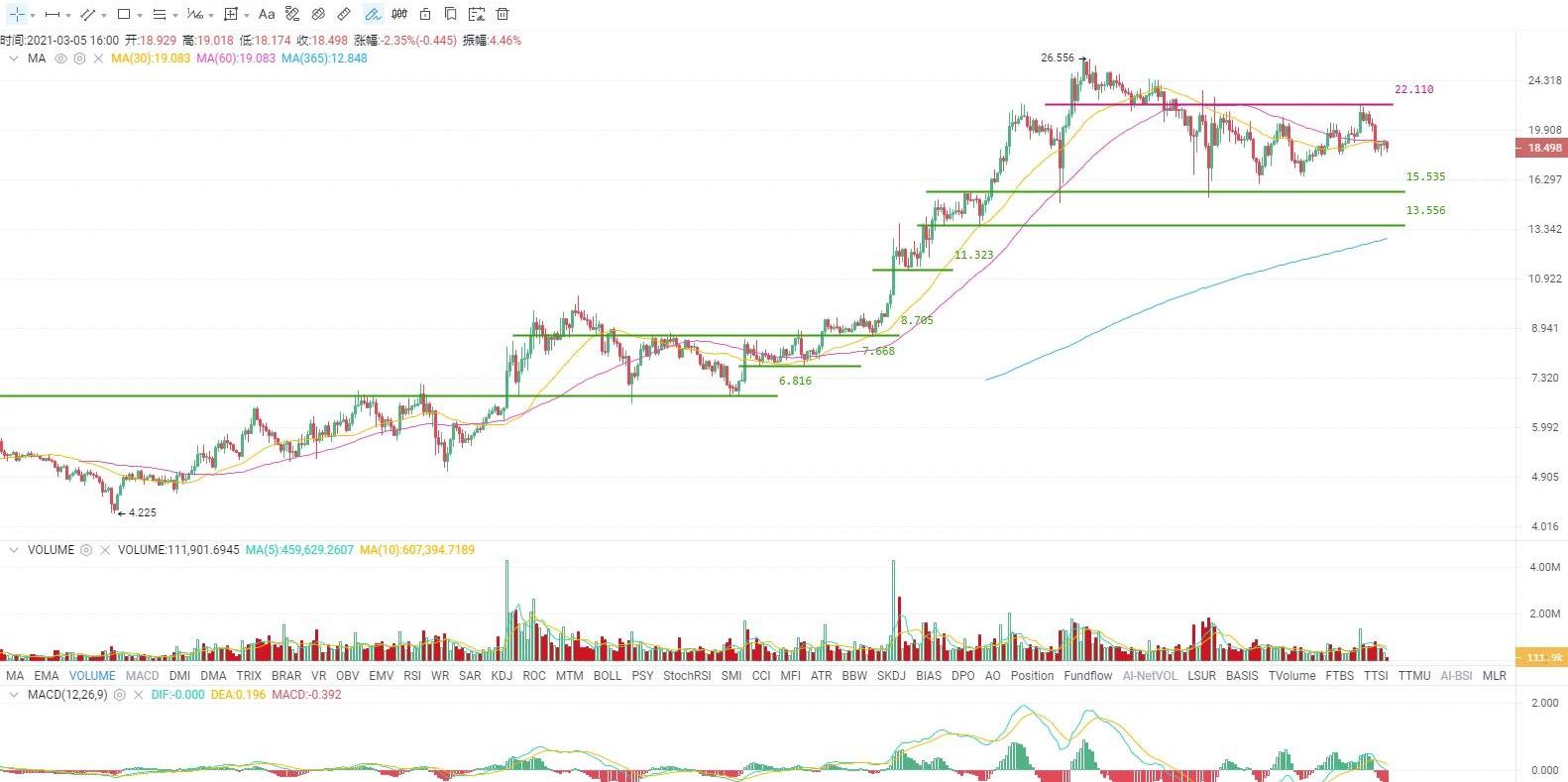 ATOM的反弹行情止步于22一线,目前也已经再次跌落至4小时MA60均线下方,多头信心遭受明显打击。从成交量看并没有出现明显放大现象,说明这轮下跌中主动性抛盘并不大。相比比特币和ETH的走势结构而言,ATOM并没有打破近期形成的低点上移特征,从这个角度看ATOM还算相对强势,注意是相对的。ATOM的临近低点在18一线,如果跌破则意味着低点上移结构破坏,需要留意这种潜在风险。那么短期需要重点关注的支撑位即为18,未跌破之前短期走势还可谨慎乐观,若下破则下跌将会延续,需要关注靠近15.5一线支撑区域,触及该区域后再大跌的可能性大大降低,那么如果触及至该区域出现止跌信号,就很可能是比较好的低吸机会。支撑:18.00--16.80--15.50阻力:19.10--20.40--22.10