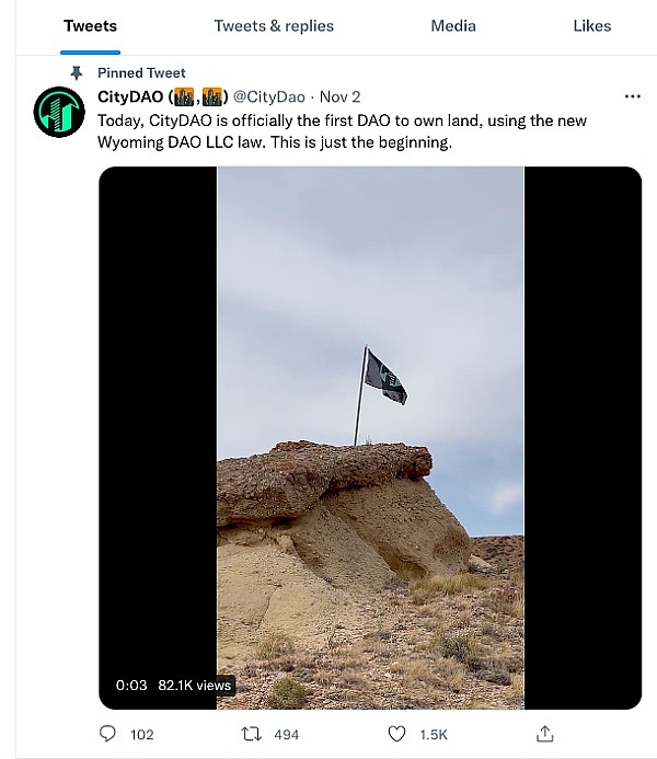 11月2日,一个名为“CityDAO”的去中心化自治组织发推文称,已经购买美国怀俄明州西北角的一块土地(约161874平方米),并且将组织旗帜插在上面。?