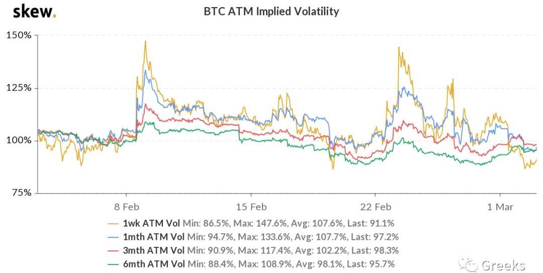 播报数据由Greeks.live和Skew.com提供。主流币在二月底出现了一波暴跌,本月初的反弹力度也不大,现在市场僵持,主流币多空力量平衡,其他币种热点也不多,观望情绪浓厚。在多空不明之时选择较低IV方向性价比较高。BTC历史波动率10d101%30d103%90d94%1Y88%期权成交量7.71亿美元,期权持仓量为90亿美元。各标准化期限隐含波动率:今日:1m96%,3m98%,6m95%3/2:1m96%,3m98%,6m94%比特币价格小幅下跌,各期限IV稳定。现在市场僵持,主流币多空力量平衡,其他币种热点也不多,观望情绪浓厚。在多空不明之时选择较低IV方向性价比较高。