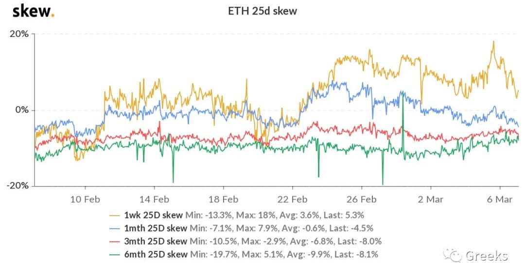 播报数据由Greeks.live和Skew.com提供。以太坊近一个月以来一直不够强势,涨幅一直不及BTC。今天以太坊受到升级消息面利好刺激,出现了近10%的涨幅。从属性来讲,ETH因为其扩展性,总是可以讲出很多故事。BTC历史波动率10d77%30d100%90d94%1Y87%期权成交量3.41亿美元,期权持仓量为89亿美元。各标准化期限隐含波动率:今日:1m96%,3m100%,6m96%3/6:1m99%,3m102%,6m98%比特币价格横盘数日,各期限IV近几日也没有大的变化。目前多空再次回到平衡,市场已经平淡了许多,为下一次波动积蓄力量。