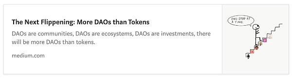 正如我之前的一篇文章中所述,越来越明显的迹象表明,DAO 的数量只会增加,而这些 token 和 DAO 之间的关系也只会变得更加巩固。更多的实验本身就意味着胜利,把这些想法推广到更广泛的以太坊生态系统中去其实并不像看起来的那样令人困惑。