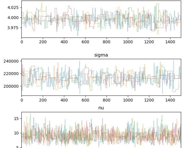 图6收敛效果由上图可知,后验分布中的参数mu、sigma和nu均已收敛。我们同时采用Gelman-Rubin检验来判断收敛情况,该检验的思想是比较不同迹之间的差异和迹内部的差异,如果得到的值低于1.1,则可以认为相应的参数已经收敛。经过计算,mu、sigma和nu在此检验下的值分别为1.02、1.02和1.01,故应视为收敛。我们获得后验分布的参数的贝叶斯估计如下: