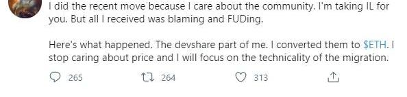 #大厨的渣男语录、吸血热、UNI#@ChefNomi“我清仓,因为我在意”“我清仓,我套利,但我有原则”“希望没有我你能过得更好”9月5日,SushiSwap的匿名创始人和首席开发者ChefNomi,在推特上称其已将分配给开发SushiSwap生态系统的部分寿司代币兑换成了17,971ETH,当时价值约为630万美元。ChefNomi声称,在将寿司代币转换成ETH后,他就可以不再关心币价,并专注于迁移。同时他在推特上辩解道:“人们质疑我是否跑路了,我没有,我还在这里,我将继续参加讨论,我会帮忙做技术部分工作,确保我们会有一个成功的迁移,我就是因为在意Sushi社区才会选择清仓,因为这样我就可以专注于技术而不被价格所干扰”。