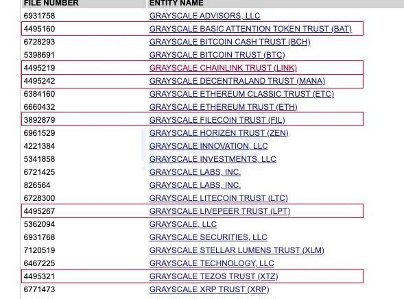 编者按:本文来自区块律动BlockBeats,Odaily星球日报经授权转载。1月22日,有媒体表示,灰度即将推出LINK、BAT等6种新信托产品。经查询特拉华州政府官网,出现了疑似与灰度有关的信托实体,分别为「GRAYSCALEBASICATTENTIONTOKENTRUST(BAT)」、「GRAYSCALECHAINLINKTRUST(LINK)」、「GRAYSCALEDECENTRALANDTRUST(MANA)」、「GRAYSCALEFILECOINTRUST(FIL)」、「GRAYSCALELIVEPEERTRUST(LPT)」、「GRAYSCALETEZOSTRUST(XTZ)」六个信托实体。同时,该网站也显示了灰度现有的同名信托实体,包括「GRAYSCALEBITCOINTRUST(BTC)」、「GRAYSCALEBITCOINCASHTRUST(BCH)」、「GRAYSCALEETHEREUMTRUST(ETH)」等。