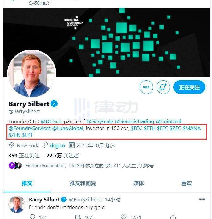 而根据微博KOL「不好描述」在微博上提供的截图显示,灰度创始人BarrySilbert此前的推特简介中,也提到了MANA、LPT等代币的持仓。
