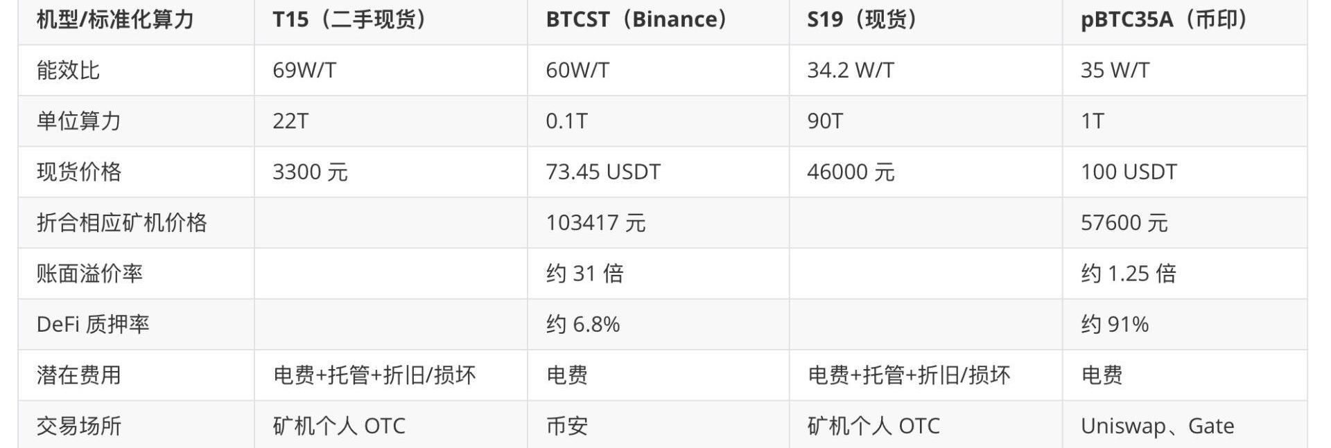 做了一个表格,比较清晰。BTCST和pBTC35A虽然都是标准化算力,对应的能效比并不相同,各自选了能效比相对接近的机型的最近现货价格。相应的价格,在阅读时都可能已经发生改变,仅供参考。