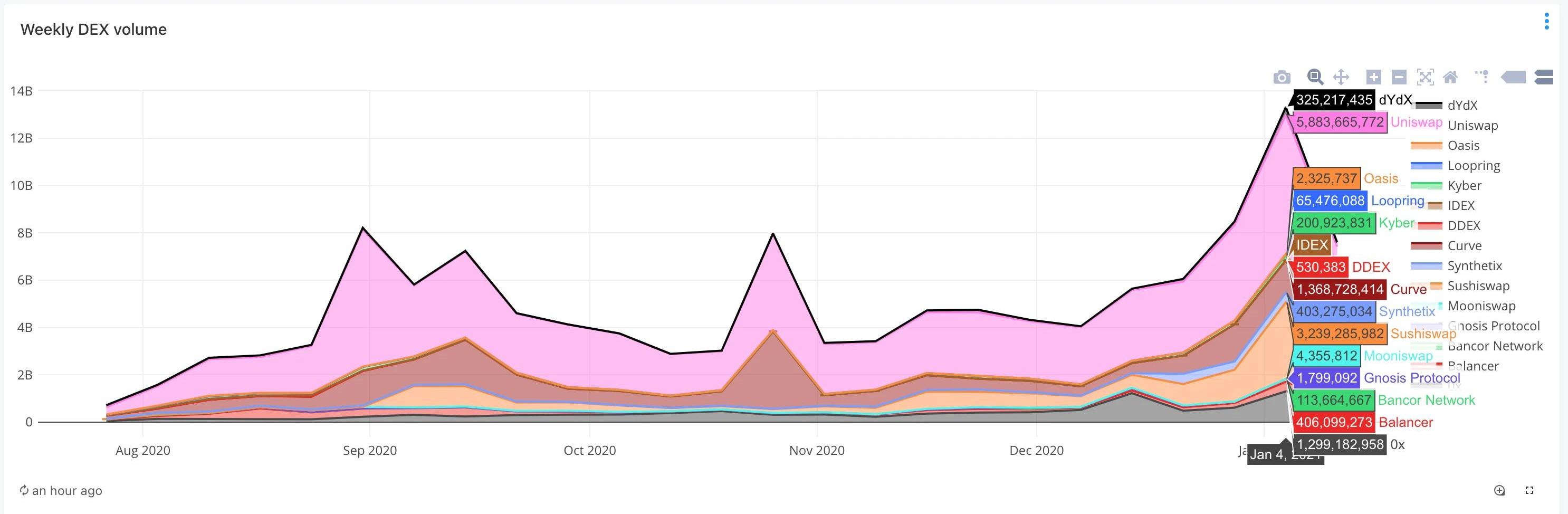 今年年初,去中心化交易所交易量达到了过去几个月的最高水平。1月4日当周,Uniswap仍以58亿美元的交易量位居市场首位,排名第二的是……32亿美元的Sushiswap。Sushiswap的交易量正在加速提升,达到了Uniswap的50%以上。值得注意的是,Sushiswap只有593个交易对,而Uniswap有28727个。流动性