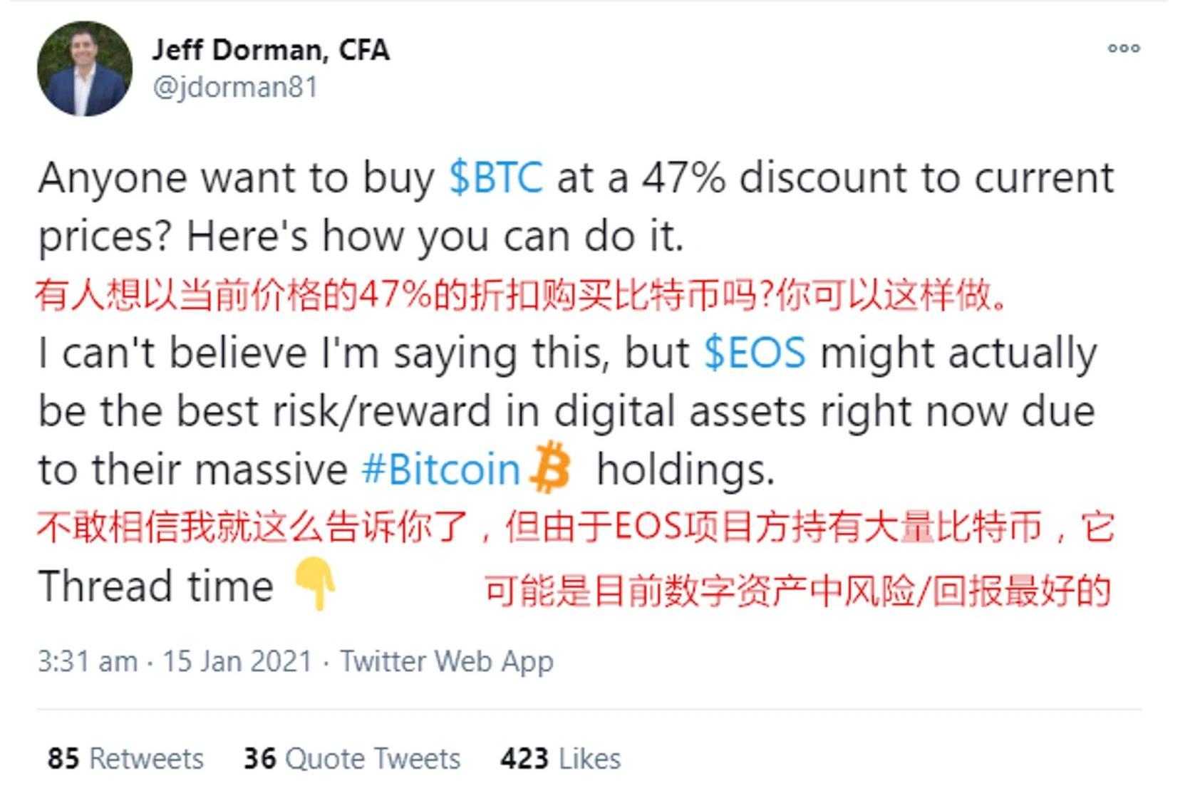 编者按:本文来自EOSCannon,Odaily星球日报经授权转载。对冲基金Arca首席投资官JeffDorman更新Twitter表示他对EOS的看好。在最初的一条推文中,他表示:有人想以当前价格的47%的折扣购买比特币吗?你可以这样做。我不敢相信我就这么告诉你了,但是由于EOS项目方持有大量的比特币,它可能是目前数字资产中风险/回报最好的。