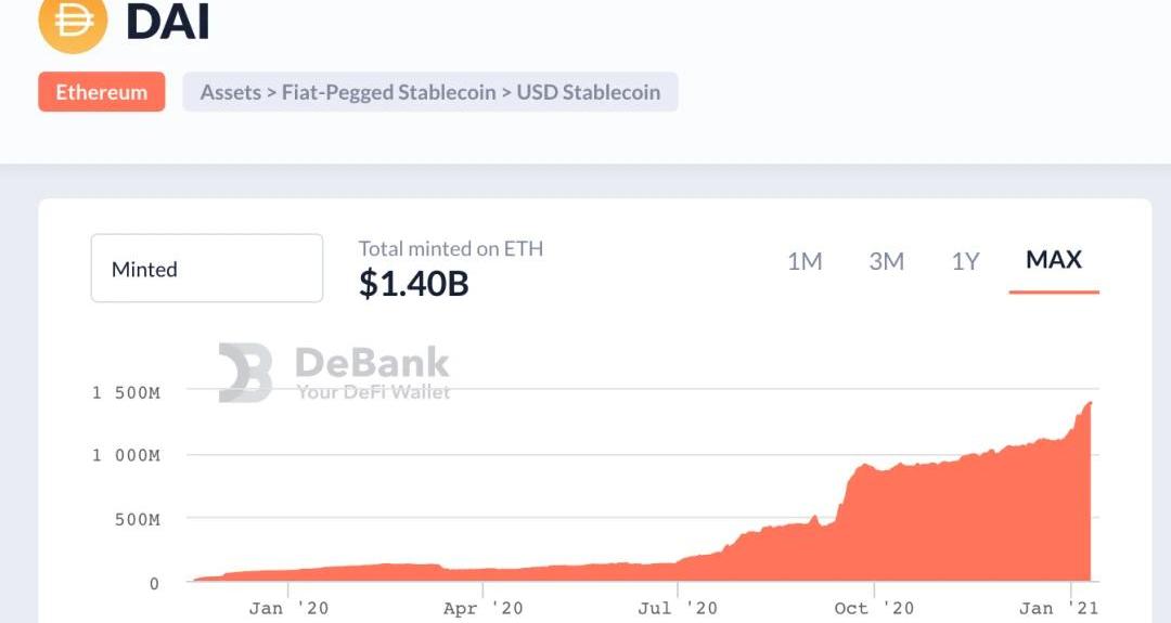 2020年的DeFi热潮让去中心化稳定币Dai的发行量超过了14亿美金,相较年初发行量7000万的发行量,增长了超过20倍(Debank数据)。由此说去中心化的稳定币是DeFi资产的基石毫不为过。
