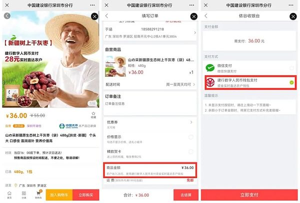 这是建设银行深圳市分行联合助农服务平台创新打造的消费助农领域的支付新模式,基于数字人民币的分账功能。