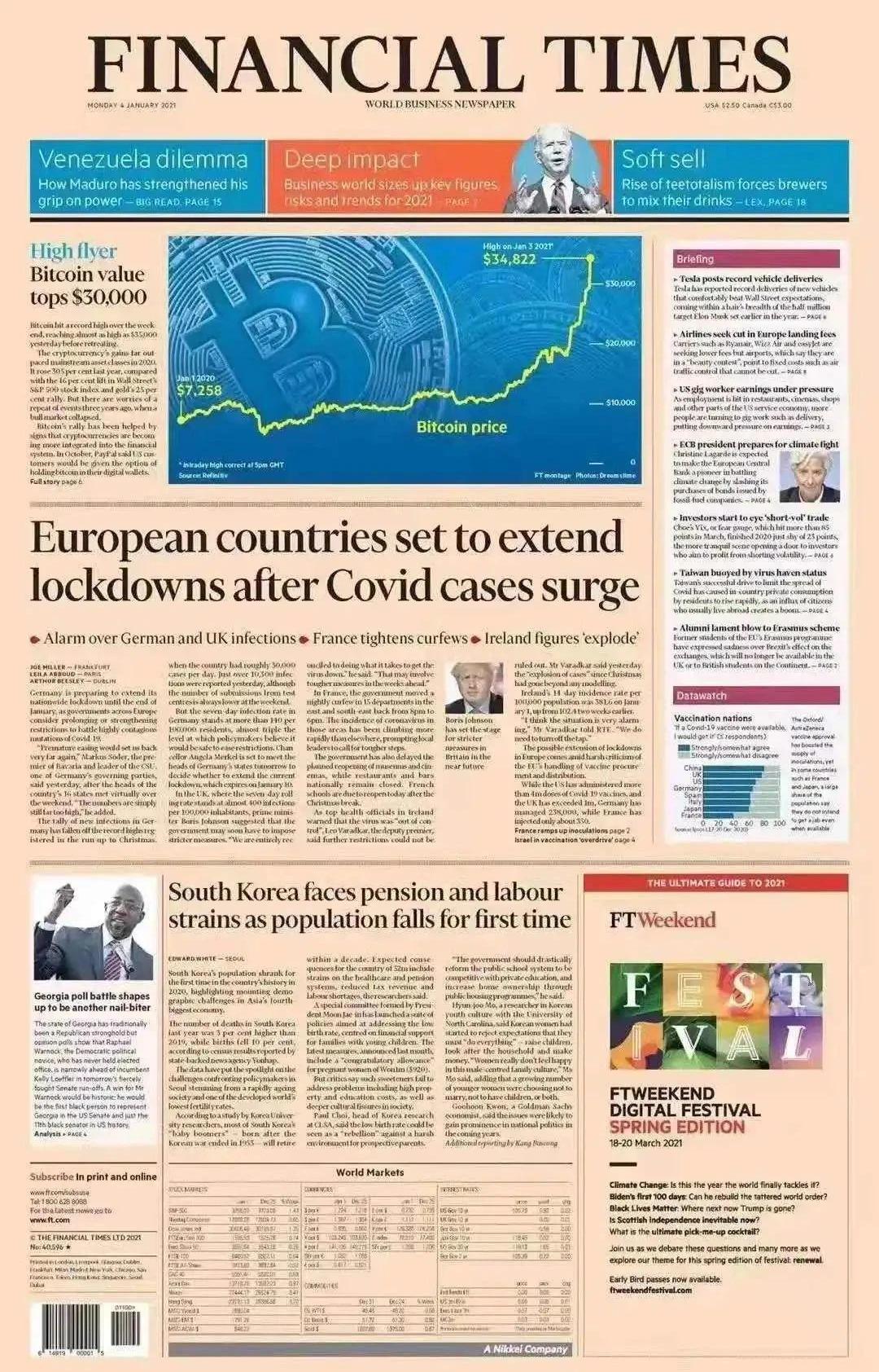 就在今天,金融时报头版刊登“比特币价格突破30000美元”的文章,文中介绍了比特币在昨日突破3.5万美元,并肯定比特币作为一种资产类别,也强调了其在2020年的表现已超过多种主流资产,认为加密货币已成为金融系统中不可或缺的一部分。