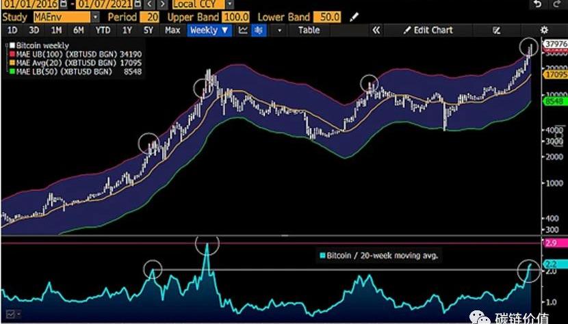 比特币现在是不是过热呢?从市场来看,牛市扩张的速度的确很快,我们发现比特币正处于价格发现过程新阶段的初期,目前状况似乎与2017年5月时有些相似,当时比特币价格大约为2,800美元,相当于前一个峰值及其20周移动均线的两倍。如果按照这个规律的话,2021年初,比特币价格也会比20周移动均线价位高出约2倍,因此超过20,000美元也就不足为奇了。比特币会延续2017年走势吗?
