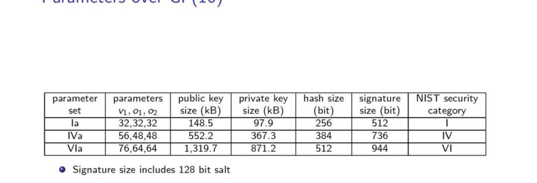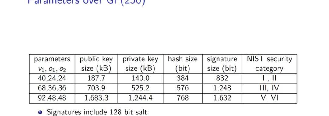 Rainbow是一种多变量签名方案,它的分层结构以不平衡石油-醋栗签名方案为基础。Rainbow层所施加的额外结构使该方案面临更多的密码分析技术,但提高了该方案的效率。Rainbow提供了快速的签名和验证以及非常短的签名,但具有非常大的公钥。选择Rainbow增加了入围签名方案的多样性;但是,由于密钥尺寸非常大,Rainbow不适合作为通用签名算法来替代目前出现在FIPS186-4中的算法。特别是,大公钥使得证书链非常大。然而,有些应用并不需要经常发送密钥。对于这样的应用,Rainbow提供了小而快的签名。
