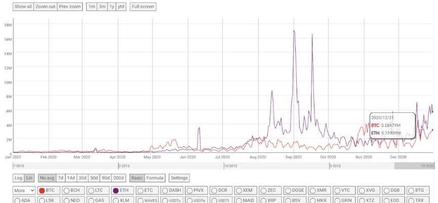2020年,主流媒体主要聚焦比特币的价格,但实际上,从年初开始的价格变化来看,截至1月2日,以太坊的涨幅高于比特币。比特币(BTC):$7,195→$29,001(4.03x)以太坊(ETH):$129.6→$737.8(5.69x)从链上的基础指标来看,相较于比特币,以太坊获得了极大的增长。随着创造实际价值的去中心化金融DeFi开始增长,基于此,以太坊所产生的链上交易手续费也远超比特币。