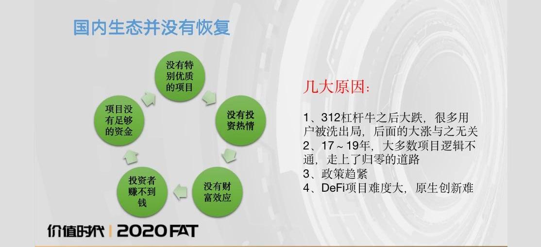 首先是去年312的时候,一波杠杆牛,遇到了美元流动性危机,很多人卖币来挽救其他资产,下跌带来强行平仓的循环,市场疯狂暴跌。杠杆牛的特点是没有外界资金进来,只是内部通过借贷等方式去进行了加仓。当时很清晰的一项数据是,中心化交易所的里的USDT借贷利率年化最低14%,最高甚至超过了80%,这显然非常不正常。散户有追涨杀跌的习惯,最后那一波大跌几乎把中国散户的BTC都了洗出去,这也是为什么说现在BTC大涨,但许多群里面的人都说自己踏空了。就我自己而言,我手里也有一些BTC,平时也是是一个习惯长持的用户,不会在短期内进行很多操作,那天早晨起来也会觉得事情超越了想象,怎么可能跌这么低?差点也把手里的BTC卖了。由于用户没有在BTC牛市里获利,就没有利润支持创新的项目。第二个原因是,2017到2019年的时候,大多数国内项目的逻辑不够牢固,比如做一个APP可以发一个币,开一个餐馆也可以发一个币,这都是不太符合逻辑的项目。这种项目跌下来之后,很难再说服别人有上涨的前景。有逻辑的币,虽然也会跌,但是总会有上涨的希望,容易东山再起。第三个是去年政策趋紧,头部机构出现了一些跟政策相关的问题。第四个可能是与行业整体发展的要求也相关。DeFi项目是去年最大热点,但DeFi项目对于团队的要求明显是要高于以前的IC0时代,因为你要搞清楚经济学逻辑以及代码逻辑,不是这个行业的资深玩家,故事都讲不圆。国内正规军不敢做,草根团队素养跟不上DeFi的需求。这几个因素综合导致了,国内目前形成了一定的恶性循环:首先是优质项目比较少见,当然也不是说完全没有,2017年市值前10的项目里面可能有3、4个跟中国有关,比如说波场,虽然存在着一定的争议,但从市值以及后续发展来看波场确实在行业里占据了一定地位,但今年DeFi前十的项目里几乎没有中国项目身影,所以大家会觉得优质项目都不在国内。缺乏优质项目导致大家都没有财富效应,进而失去了投资热情,下一步循环就是散户也不愿意参与,机构也不愿意参与,项目方最后也没有钱来开发,然后优质项目就更少了,最终形成了这么一个比较糟糕的恶性循环。原因就是我上边提到的那四点。刚刚说的这些问题,我相信很多人心里是有感受的,包括大家在投资的时候可能都不会好好去看国产项目,因此我觉得行业内是需要做一些反思的。反思之后我们需要给出一定答案,这里是我的一些思考方向,可以作为一个引子来让大家思考优质项目到底应该往哪个方向做?怎样一步步开始?首先,我觉得对于优质项目而言,要选好赛道。而在公链之后第二个大方向就是DeFi。虽然去年像资产上链、STO这些概念也会火,但我觉得这些概念的逻辑并不像DeFi那么坚固。我个人觉得DeFi是公链之后第二个真正有着合理逻辑的方向。
