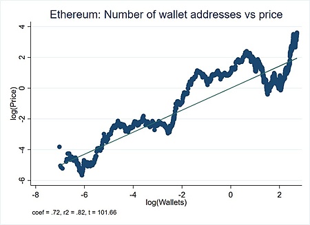 但这还不是最有趣的部分,有趣的是,以太坊价格增速与以太坊GDP增速(即以太坊的经济总产出)之间也应该存在 1:1 的关系。