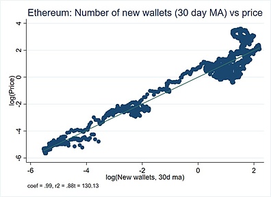 下面这张图就更引人注目了。钱包地址增长的加速(即新地址的增长率)与 ETH价格增长几乎是 1:1 的关系。