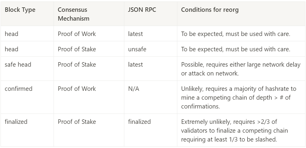 在 POW(工作证明)下,总是有可能出现重排的情况,应用程序通常会等待几个区块在一个新的头块(head)上被开采出来,然后再将其视为不太可能从公认链中删除,或 "确认"。在合并之后,我们反而有了 finalized(最终确定)的和 safe head(安全头块)的概念。这些区块甚至可以比 "确认 "的 POW(工作证明)区块更可靠地使用,但需要转变观念以正确使用。