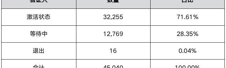 截止目前,ETH2.0信标链上一共注册了45,040个验证人,其中已经激活在运行的验证人数量为32,255个,占比71.61%;处于等待中的验证人数量为12,769,占比28.35%;退出的验证人数量为16,占比为0.04%。详细如下表所示: